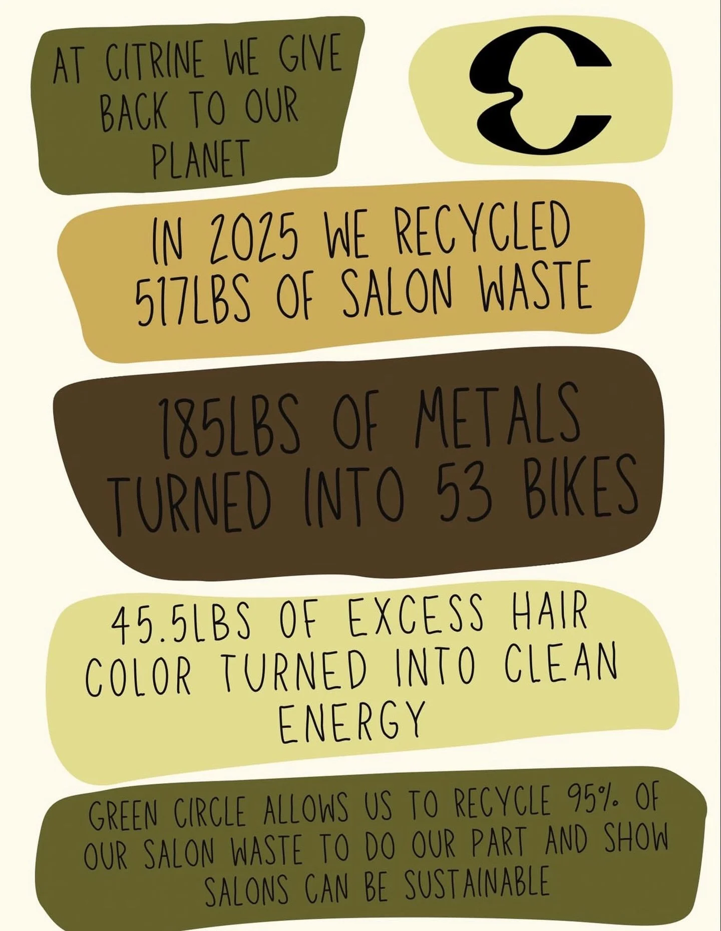 It's important to us to counteract the impact the beauty industry has on the environment. With the help of a company called Green Circle, we are able to recycle 95% of our beauty waste. This includes hair, excess color, foils, PPE, single use items, and more. A small environmental fee is added to each transaction to help cover the cost of being a part of this program.