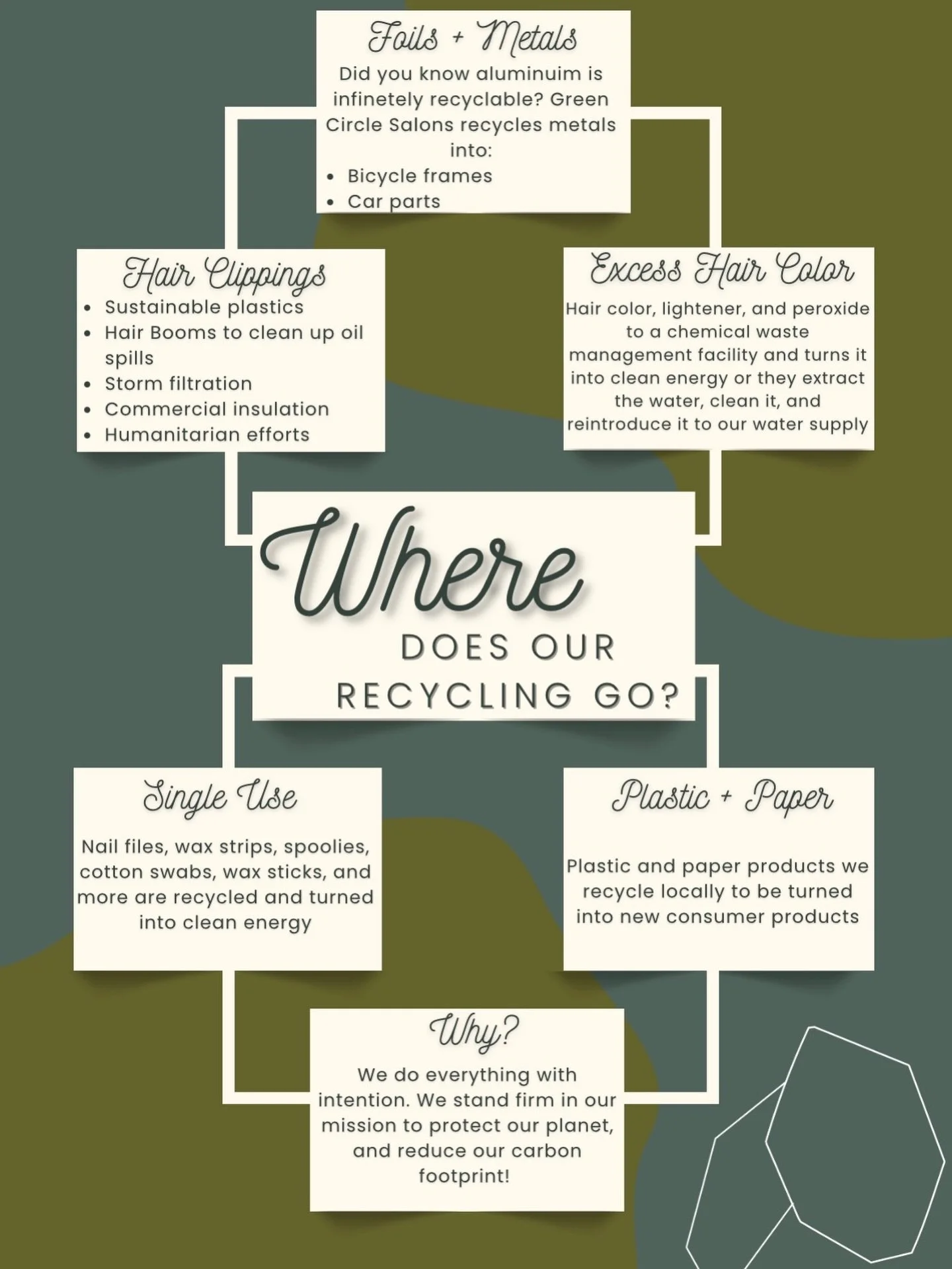 It's important to us to counteract the impact the beauty industry has on the environment. With the help of a company called Green Circle, we are able to recycle 95% of our beauty waste. This includes hair, excess color, foils, PPE, single use items, and more. A small environmental fee is added to each transaction to help cover the cost of being a part of this program.